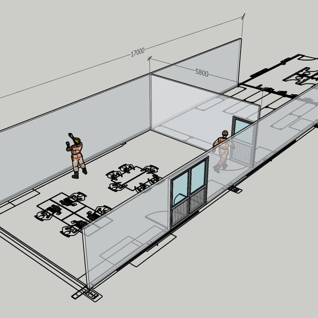 แบบสร้าง ห้องพักคนงานในโรงงาน วางบนงานสำรวจพื้นที่เสมือนจริง